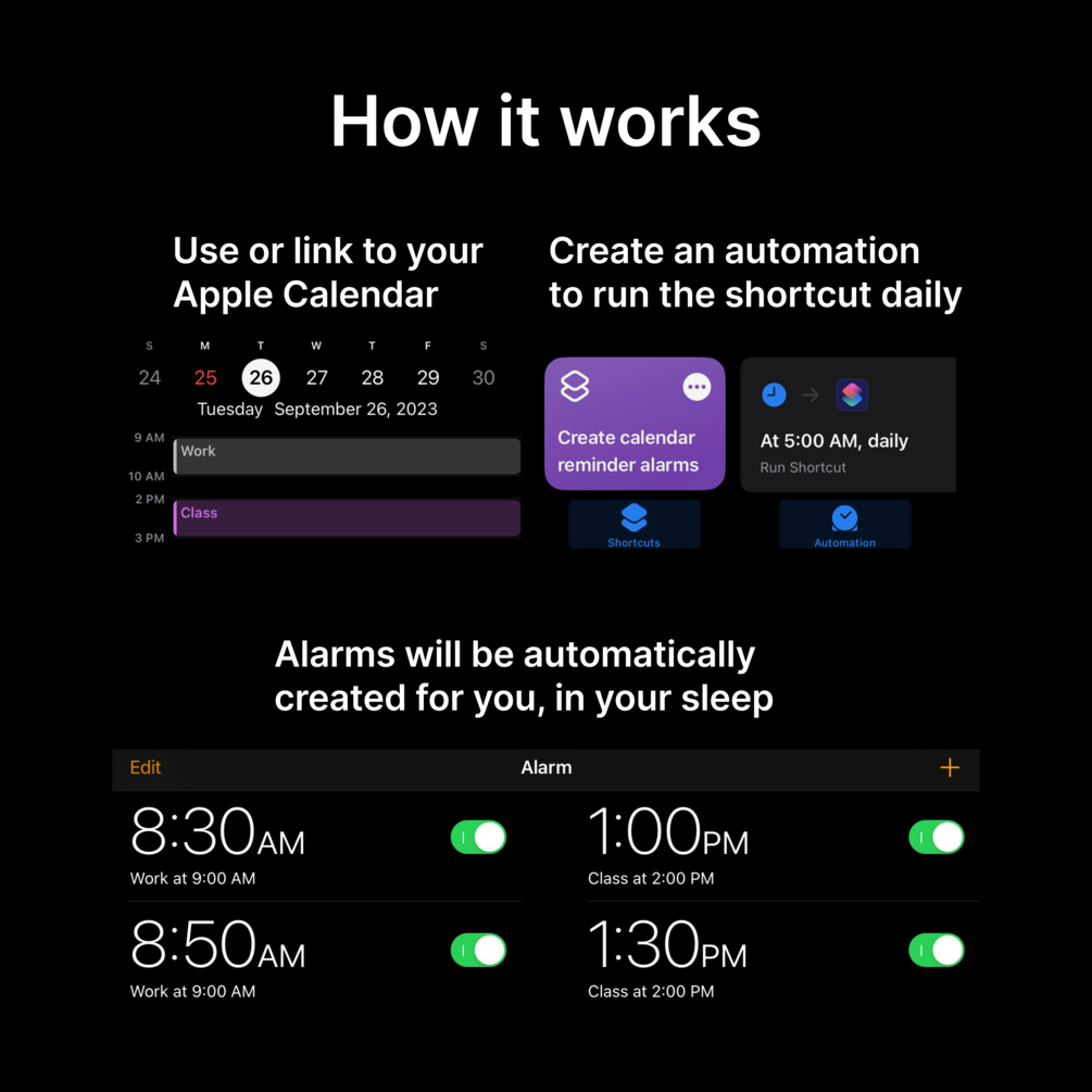 Once you set up an automation, the shortcut will run every morning, creating all your alarms before you even wake up.